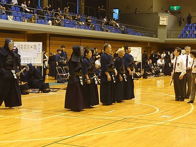 大会は、開会式直後に豊村東盛先生と氏家道男先生が日本剣道形を披露され、第一試合の主審を担当した水田先生の「正面に礼!」という号令で開始となりました。