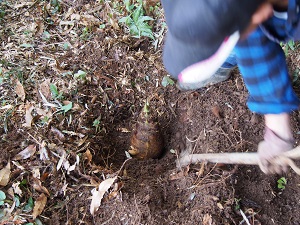 山崎先生のお家に筍をいただきにあがりました。山崎先生のお家の裏手から、右手に柿の木ががたくさん植わっている気持ちのよい小径を辿ると、左手に大きな竹林が現れます。 ![]() 最初に見つかる時はこんな感じです。目ではとても探し出せません。山崎先生が昨日、足で探して目印をつけておいてくださいました。 ![]() 「それでは掘るぞ」と山崎先生。 ![]() 周囲を鍬でぐるっと掘ると、おお!大物が出現しました! ![]() 最後にシャベルで根っこのところをぐいっと持ち上げます。 山崎先生にお手本を見せていただき、私も筍掘りに挑戦しました。慣れない鍬に四苦八苦、最初は「腰が入っとらんぞ!剣道と同じだぞ」と励ましていただきながら苦戦しましたが、鍬を大きく振り回すより、小さく振って掘っていった方が筍の近くを正確に掘れることに気がつきました。あれれ?これも剣道と関係があるでしょうか? お天気の良い日に大収穫で、楽しい一日でした!山崎先生、どうもありがとうございました。 |