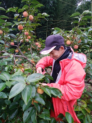 台風が近づいているので、山崎先生のお家にうかがい、11月初旬に収穫期を迎えるはずの柿「陽豊」を一部早めに収穫しました。
